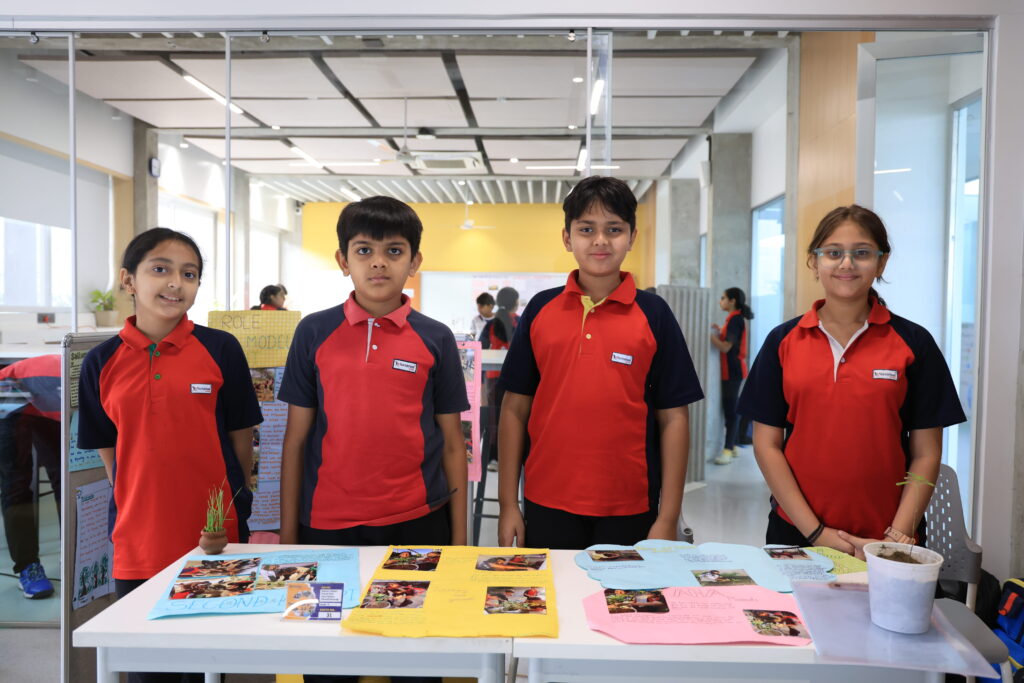 Rajveer Lakhani, Pransh Patel, Vincy Sakaria, and Khwaish Sarawagi undertook this whole-class Project-Based Learning (PBL) initiative as part of their Unit of Inquiry on Role Models. The project focused on promoting sustainability and environmental responsibility through the planting and nurturing of vegetable saplings. Inspired by role models who contribute positively to society, the students engaged in a range of learning experiences including a guest speaker session, field visits, research, and expert guidance to understand plant growth and care. They actively participated in planting saplings, maintaining them with the support of the school gardener, and sharing their knowledge with younger students.